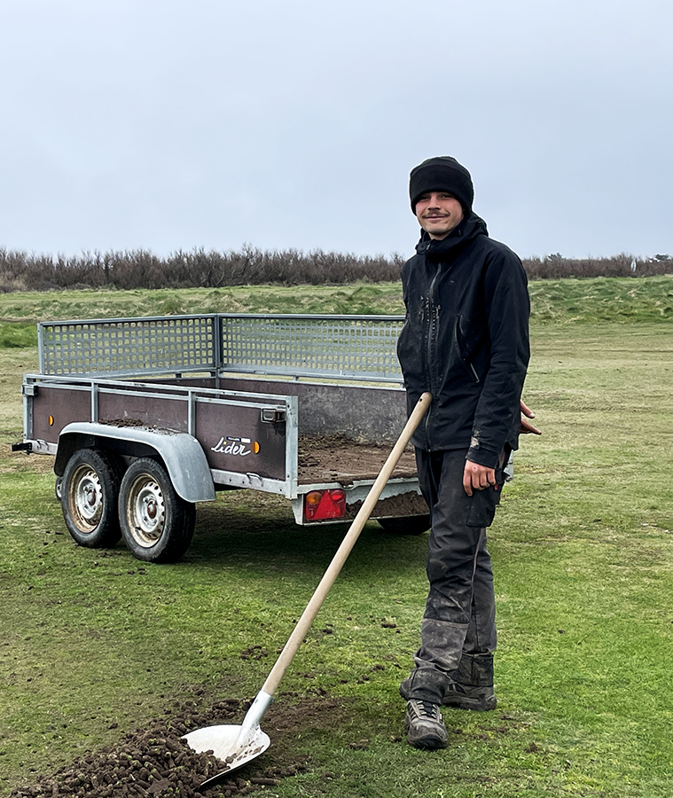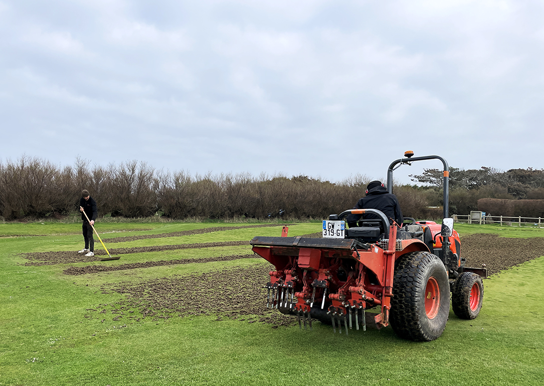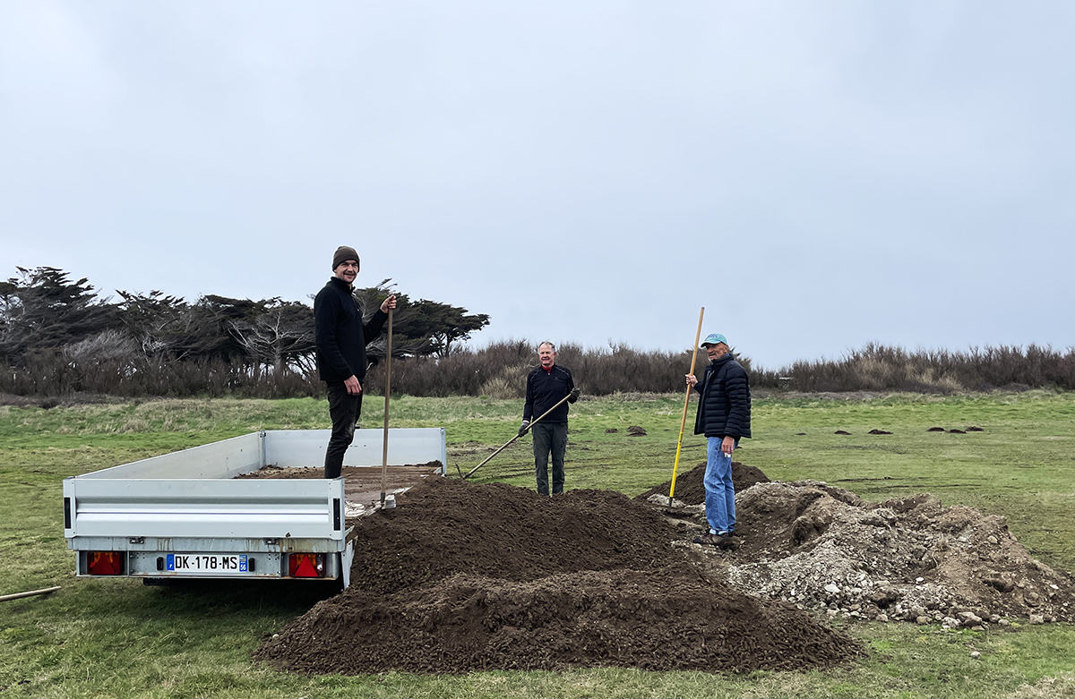 Bienvenue à Martin Alain qui vient d'être embauché par le club ! Martin a fait un bac pro aménagement paysager. Il a une spécialisation sur les terrains sportifs et de golf. Il est bellilois et est très content de travailler à l'année sur son l'île. Et il a déjà bien manié la pelle lors du carottage des greens.