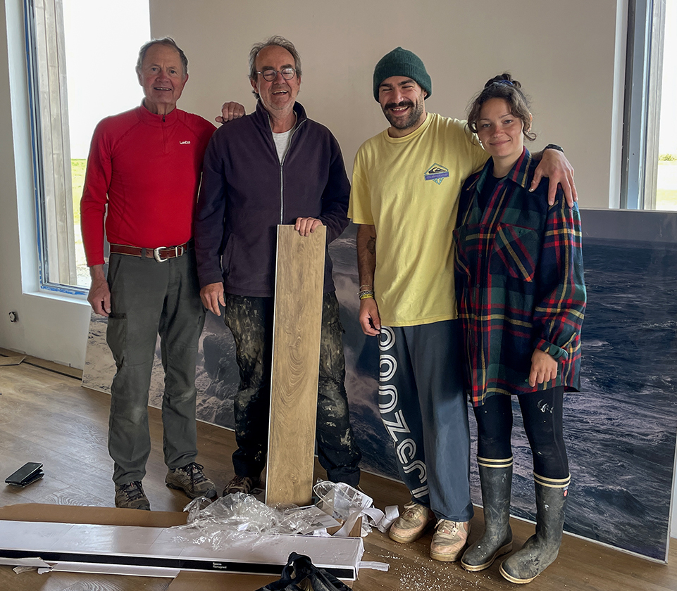Citons Jean-Baptiste Cavrois qui nous a fait bénéficier de ses connexions pro en demandant au magasin Les parquets du Golfe à Vannes de nous faire un prix très, très doux. Grâce à ce magasin, aux compétences de Jean-Baptiste et à son matériel, notre sol a été posé en cinq heures de temps. Citons aussi Maël Dugay. Maël a été embauché un mois avant l'ouverture de l'accueil pour pouvoir aider aux travaux. Il n'a ménagé ni sa peine ni son temps et a même enrôlé sa compagne Léna (très efficace) pour l'aider. Enfin, « the last but not the least », citons Catherine et Pierre Guénot qui ont été corvéables à merci et ont été de tous mais vraiment de tous les travaux !