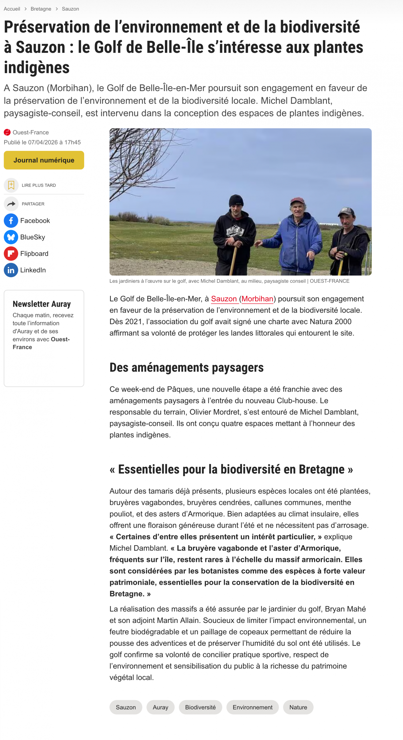 Dans le dernier Swing nous vous avons tout dit sur le club-house et sur l’aménagement paysagé de ses abords. Notre engagement envers la biodiversité a été été relayé dans le numéro du 7 avril dernier d’Ouest France. Voyez plutôt 😊 :
